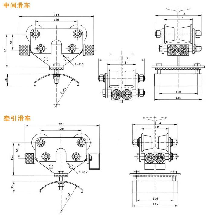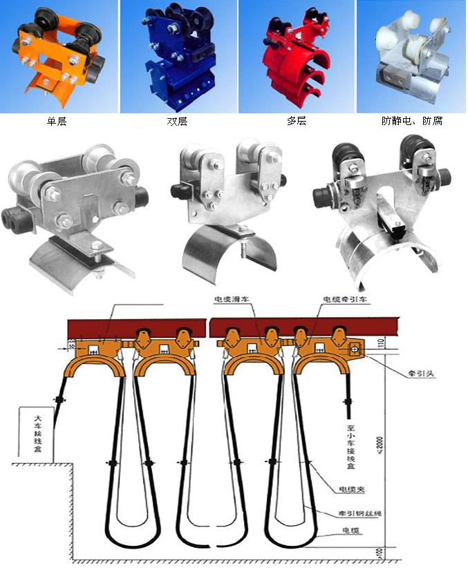 分為中載荷型、重載荷型、和輕載荷型,因此滑車走輪為Ф80、Ф63、Ф50的三種,承載能力≤50~150kg,每類按托板層數(shù)分為單層、雙層、三層,每類中有三種形式,首端為電纜牽引車,終端為固定掛線架,中間為電纜滑車。